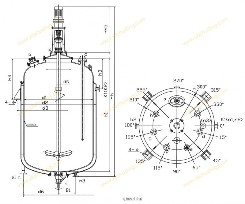 K50L-K5000L電加熱搪玻璃反應(yīng)釜(電加熱搪瓷反應(yīng)釜)設(shè)計圖紙及參數(shù)如下所示: