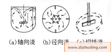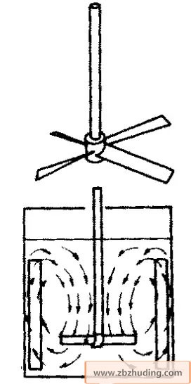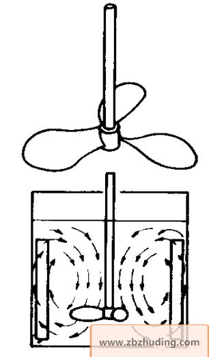 流體流動方向平行于攪拌軸,流體由槳葉推動,使流體向下流動,遇到容器底面再向上翻,形成上下循環(huán)流。